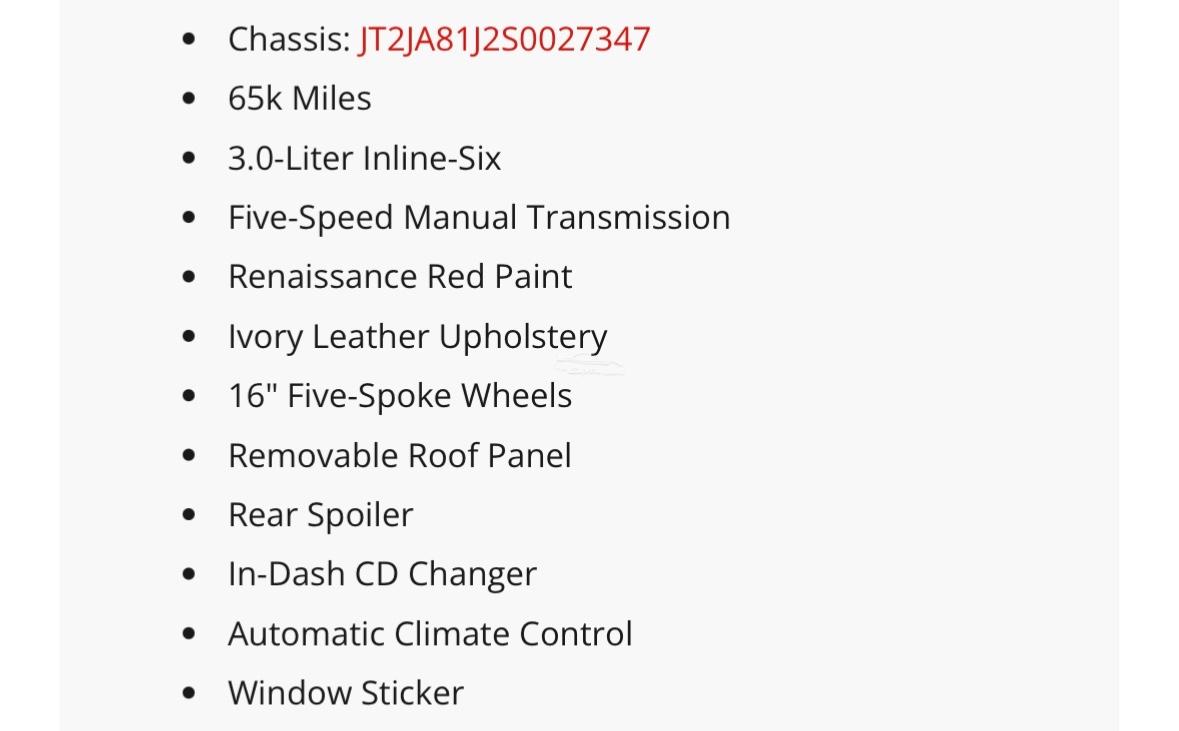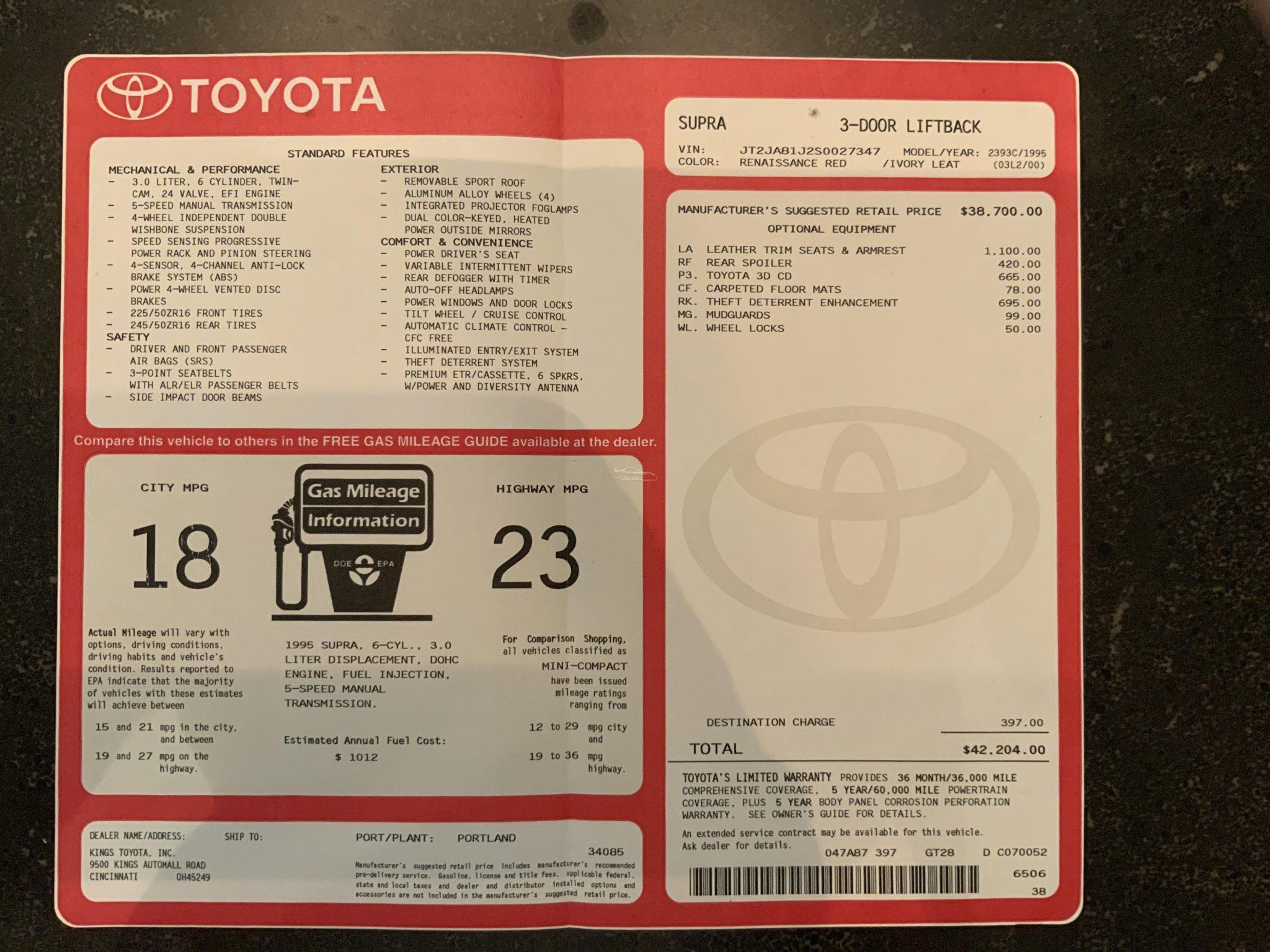 CF CARPETED FLOOR MATS LA LEATHER TRIM SEATS & ARMREST MG MUDGUARDS P3 TOYOTA 3D CD RE 48 STATE EMISSIONS REQUIREMENT RF REAR SPOILER RK THEFT DETERRENT ENHANCEMENT WL WHEEL LOCKS